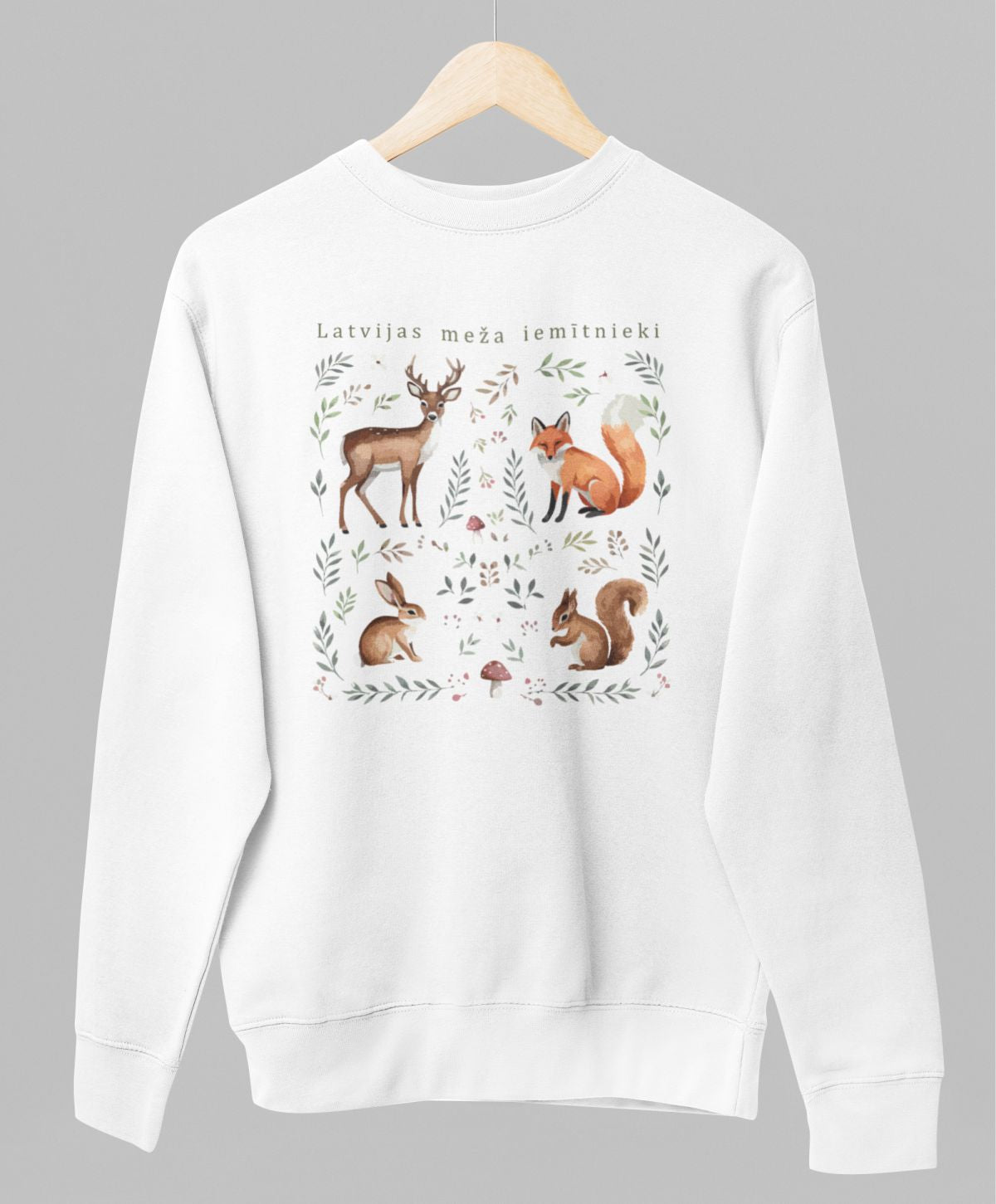 Balts UNISEX džemperis bez kapuces "Meža iemītnieki"