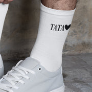 Białe skarpetki z napisami Tata z malym sercem. Zapakowane w stylowe brązowe pudełko.