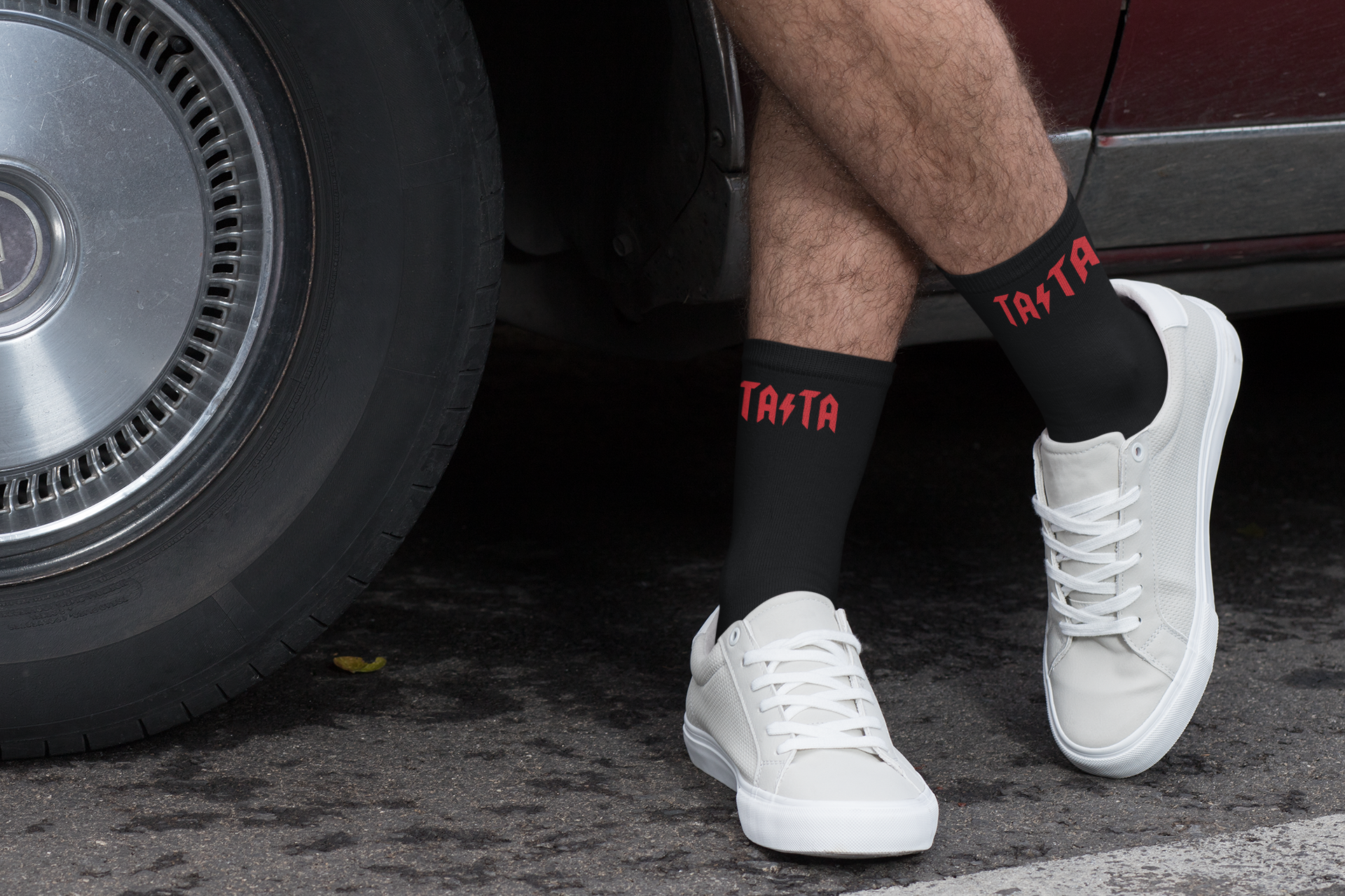 TATA Rocks - Skarpetki z napisami. Czerwony. Zapakowane w stylowe pudełko z okienkiem.
